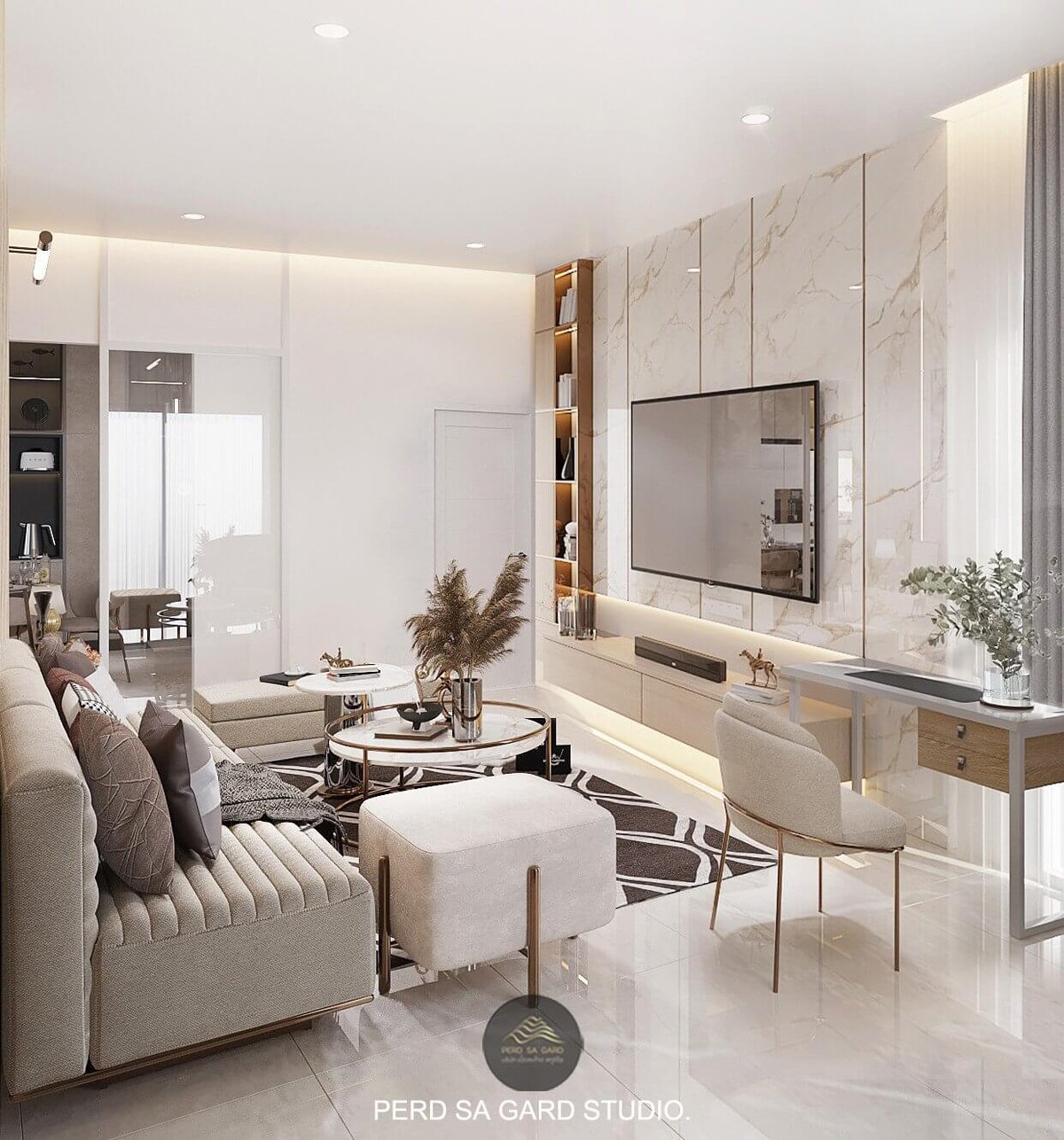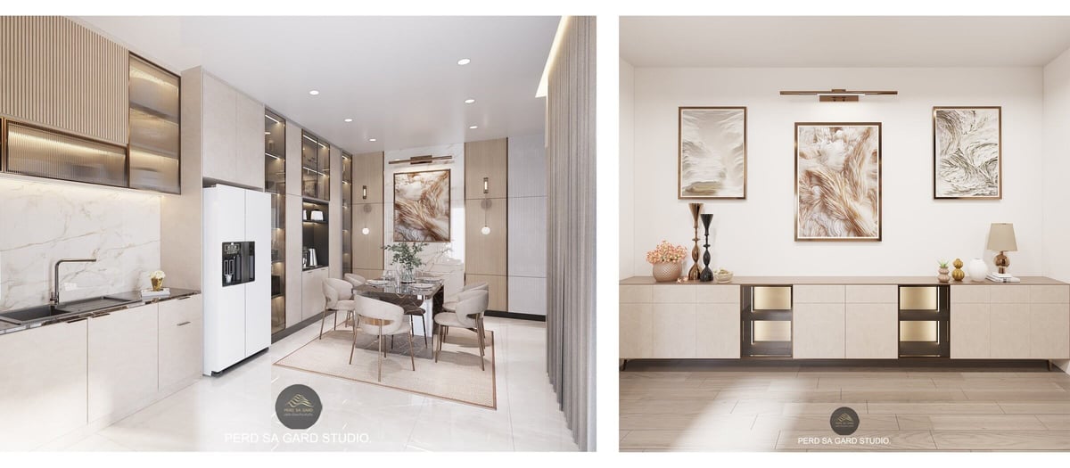 การออกแบบภายในพื้นที่ครัวและห้องทานอาหาร รวมถึงมุมตกแต่ง ใช้โทนสีอ่อนและวัสดุหินอ่อนผสมงานไม้ เพื่อสร้างบรรยากาศหรูหราแต่ยังคงความอบอุ่น เฟอร์นิเจอร์กำมะหยี่และขาโลหะสีทองช่วยเพิ่มความทันสมัย งานศิลป์โทนธรรมชาติและของตกแต่งเล็กๆถูกจัดวางอย่างพอดี ทำให้พื้นที่ดูสมดุล สวยงาม และใช้งานได้จริง