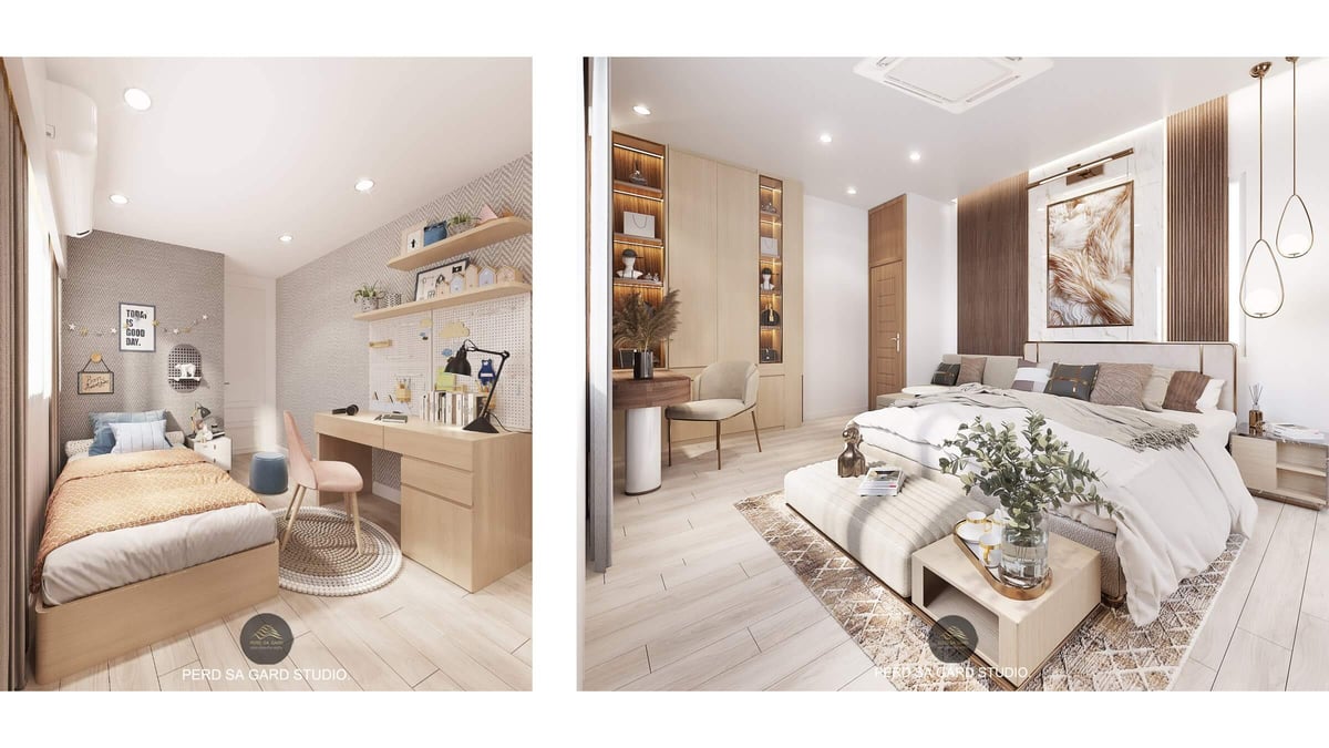 การออกแบบห้องนอนเล็กเน้นโทนไม้สีอ่อน เฟอร์นิเจอร์กะทัดรัด และมุมทำงาน เพื่อใช้พื้นที่คุ้มค่าและอบอุ่น ส่วนห้องนอนใหญ่เน้นความหรูหราในสไตล์โมเดิร์น ใช้โทนอบอุ่น หินอ่อน และเฟอร์นิเจอร์บิวท์อิน สร้างบรรยากาศที่สวยงามและน่าพักผ่อน