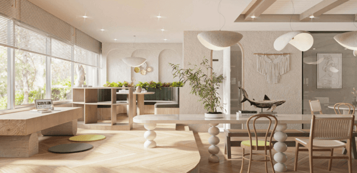 งาน Interior Design ควรสะท้อนความเป็นเอกลักษณ์ของโครงการ โดยการใช้วัสดุหรือการตกแต่งที่มีความเป็นตัวตน เช่น การเลือกใช้โลโก้ของโครงการ หรือการออกแบบที่สะท้อนถึงแนวคิดของโครงการ ทำให้พื้นที่ส่วนกลางมีความเชื่อมโยงและมีความเป็นเอกลักษณ์เฉพาะตัว